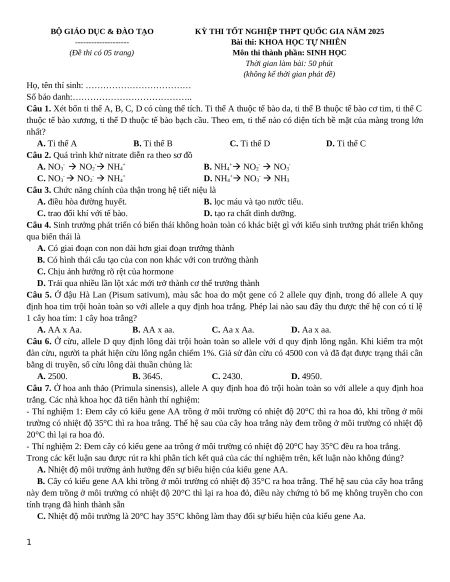 Bài thi: KHOA HỌC TỰ NHIÊN