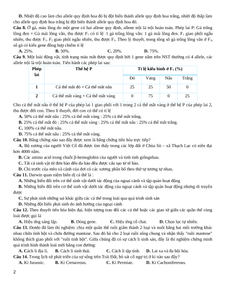 Câu 14. Trong lịch sử phát triển của sự sống trên Trái Đất, bò sát cổ ngự trị ở kỉ nào sau đây? A. Kỉ Jurassic. B. Kỉ Cretaceous. C. Kỉ Permian. D. Kỉ Cacbonifereous. 2 3