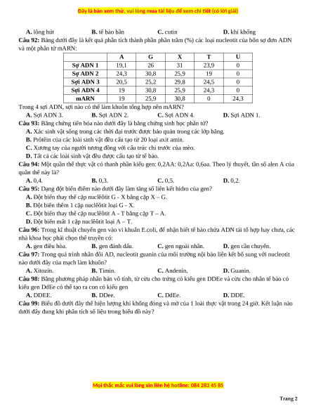 Câu 92: Bảng dưới đây là kết quả phân tích thành phần phần trăm (%) các loại nucleotit của bốn sợ đơn ADN và một phân tử mARN: A G X T U Sợ ADN 1 19,1 26 31 23,9 0 Sợ ADN 2 24,3 30,8 25,9 19 0 Sợi ADN 3 20,5 25,2 29,8 24,5 0 Sợi ADN 4 19 30,8 25,9 24,3 0 mARN 19 25,9 30,8 0 24,3