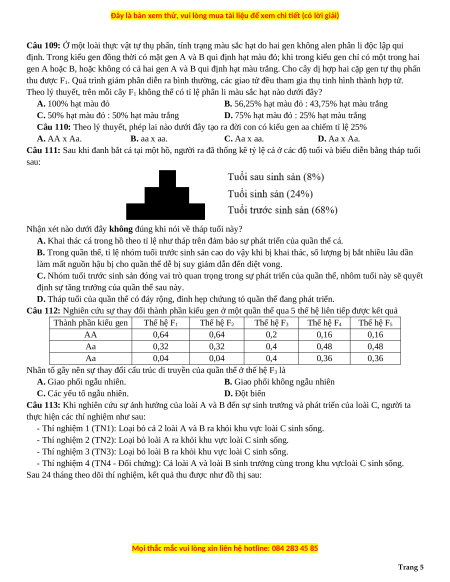 Câu 94: Một quần thể thực vật có thanh phần kiểu gen: 0,2AA: 0,2Aa: 0,6aa. Theo lý thuyết, tần số alen A của quần thể này là? A. 0,4. B. 0,3. C. 0,5. D. 0,2.