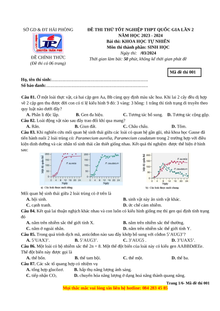 Đề thi thử tốt nghiệp Sinh học Sở Hải Phòng năm 2024