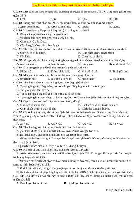 Câu 88. Một quần thể đang ở trạng thái cân bằng di truyền có tần số alen B là 0,6. Tỉ lệ kiểu gen Bb của quần thể là A. 0,24. B. 0,36. C. 0,16. D. 0,48.