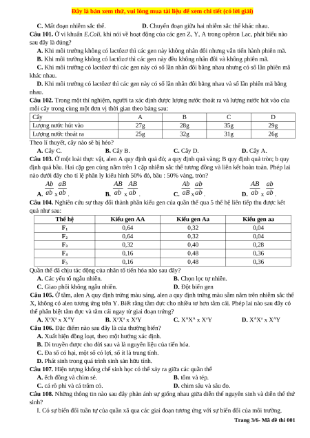 Câu 104. Nghiên cứu sự thay đổi thành phần kiểu gen của quần thể qua 5 thế hệ liên tiếp thu được kết quả như sau: Thế hệ Kiểu gen AA Kiểu gen Aa Kiểu gen aa F1 0,64 0,32 0,04 F2 0,64 0,32 0,04 F3 0,32 0,40 0,28 F4 0,16 0,48 0,36 F5 0,16 0,48 0,36