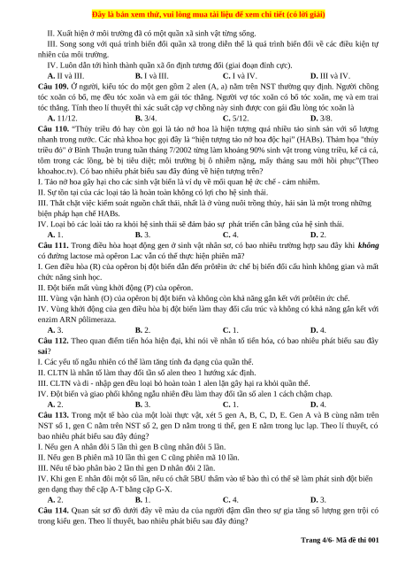 Câu 110. “Thủy triều đỏ hay còn gọi là tảo nở hoa là hiện tượng quá nhiều tảo sinh sản với số lượng