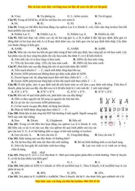Câu 93. Trong số 64 bộ ba, số bộ ba mã hóa cho axit amin là A. 64. B. 42. C. 65. D. 61.