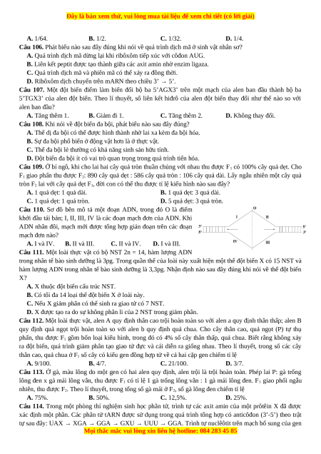 Câu 107. Một đột biến điểm làm biến đổi bộ ba 5’AGX3’ trên một mạch của alen ban đầu thành bộ ba