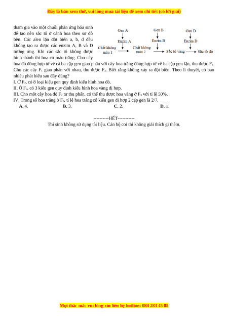 Câu 120. Ở một loài hoa, xét ba cặp gen phân li độc lập, các gen này quy định các enzim khác nhau cùng