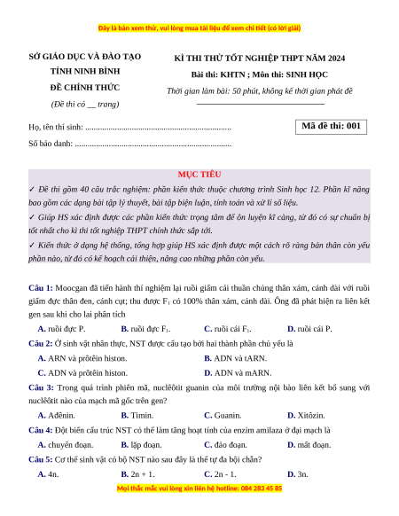 Đề thi thử tốt nghiệp Sinh học Sở Ninh Bình năm 2024