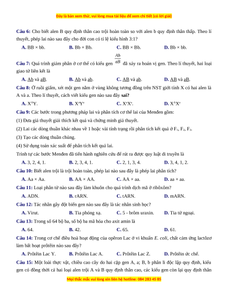 Câu 6: Cho biết alen B quy định thân cao trội hoàn toàn so với alen b quy định thân thấp. Theo lí