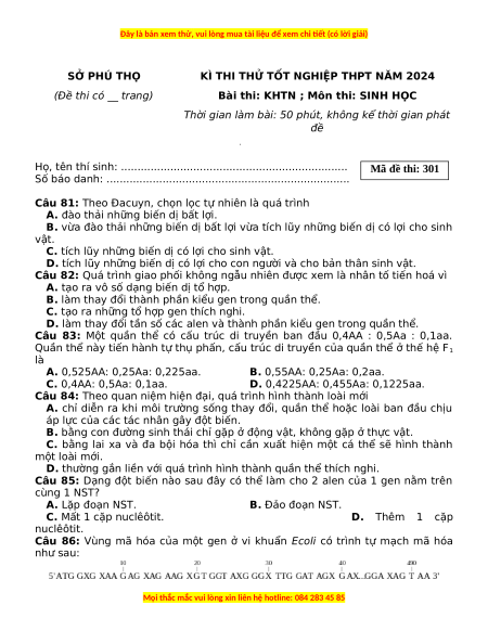 Đề thi thử tốt nghiệp Sinh học Sở Phú Thọ năm 2024