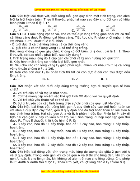 Câu 91: Ở 1 loài động vật có vú, cho cá thể đực lông trắng giao phối với cá thể