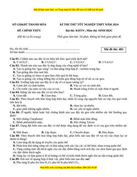Đề thi thử tốt nghiệp Sinh học Sở Thanh Hóa năm 2024