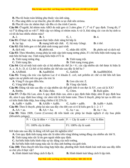 Câu 99: Năm 1909, Coren (Correns) đã tiến hành các phép lai thuận nghịch ở cây hoa phấn (Mirabilis jalapa):