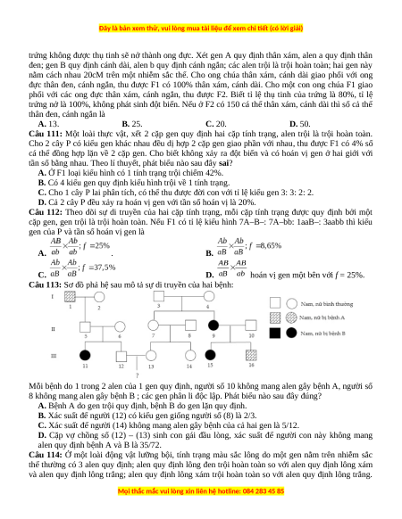 Câu 113: Sơ đồ phả hệ sau mô tả sự di truyền của hai bệnh:
