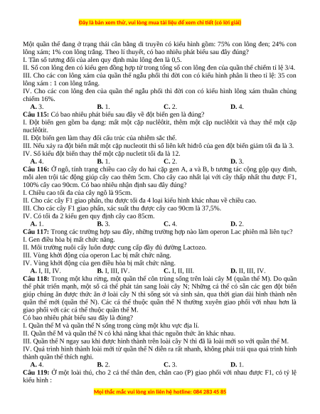Câu 114: Ở một loài động vật lưỡng bội, tính trạng màu sắc lông do một gen nằm trên nhiễm sắc