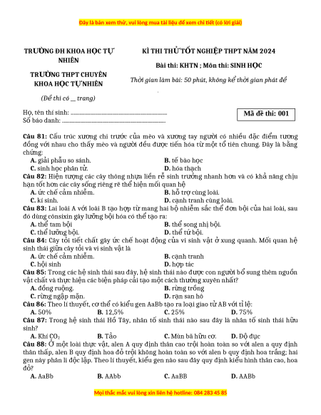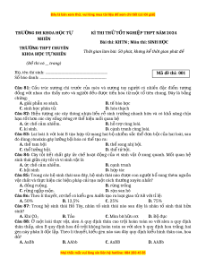 Đề thi thử tốt nghiệp Sinh học trường ĐH Khoa học Tự nhiên năm 2024