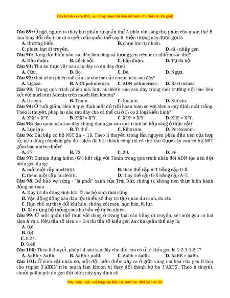 ộ thành công thì có thể thu đ c ượ cây con có bộ NST g m bao nhiêu chi ồ c? ế A. 27. B. 72. C. 20. D. 36 Câu 97: Guanin d ng ạ hi m ế (G*) k t ế c p ặ v i
