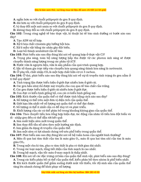 Câu 95: Bào quan nào sau đây không tham gia vào quá trình hô hấp sáng ở thực vật? A. L c l ụ p. ạ B. Ti thể. C. Ribôxôm. D. Perôxixôm. Câu 96: C i ả b p