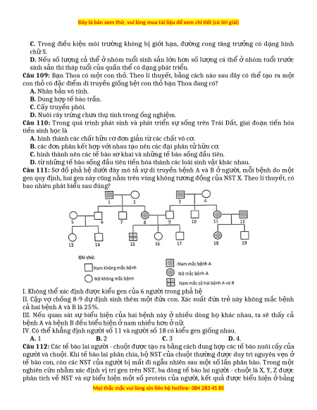 ượ cả thể ở nhóm tu i ổ sinh s n ả l n ớ h n ơ số l ng ượ cá thể ở nhóm tu i ổ tr c ướ sinh s n thì tháp tu ả i c ổ a qu ủ n th ầ có d ể ng phát tri ạ ển. Câu 109: B n ạ Thoa có m t ộ con th . ỏ Theo lí thuy t, ế b ng