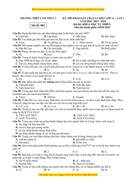 TRƯỜNG THPT CẨM THỦY 1 KỲ THI KHẢO SÁT CHẤT LƯỢNG LỚP 12 – LẦN 1 NĂM HỌC 2023 - 2024