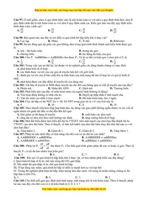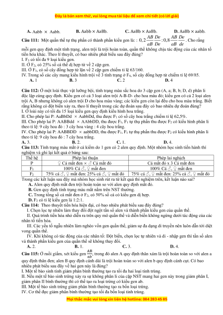 Câu 110: Cho biết mỗi gen quy định một tính trạng, tính trạng trội là trội hoàn toàn. Theo lí thuyết, phép