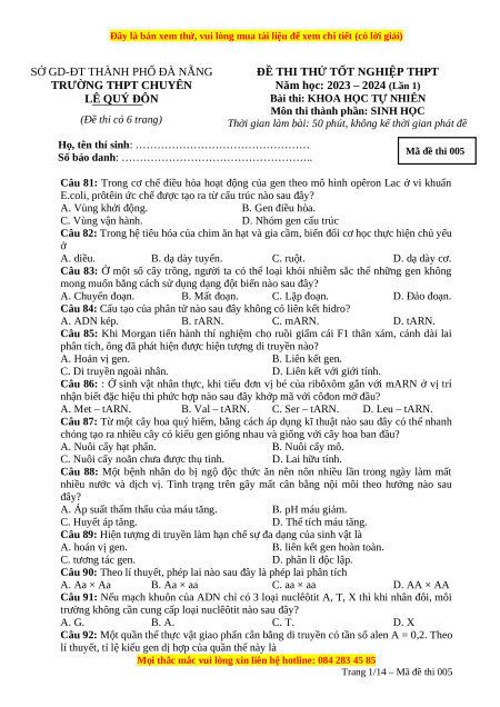 Đề thi thử tốt nghiệp Sinh học trường THPT Chuyên Lê Quý Đôn - Đà Nẵng lần 1 năm 2024