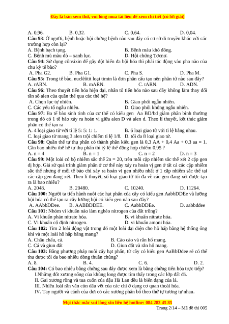 Câu 90: Theo lí thuyết, phép lai nào sau đây là phép lai phân tích A. Aa × Aa B. Aa × aa C. aa × aa D. AA × AA