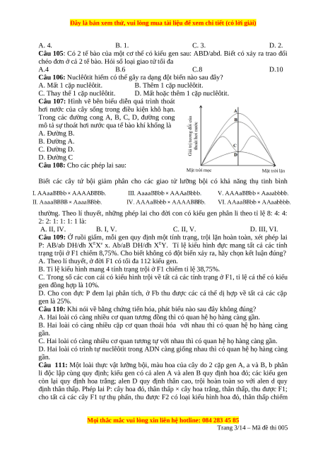 Câu 105: Có 2 tế bào của một cơ thể có kiểu gen sau: ABD/abd. Biết có xảy ra trao đổi