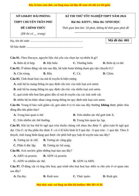 Đề thi thử tốt nghiệp Sinh học trường THPT Chuyên Trần Phú - Hải Phòng lần 1 năm 2024