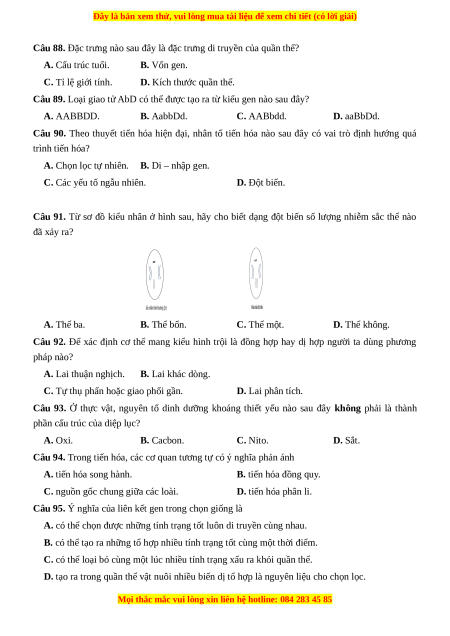 Câu 88. Đặc trưng nào sau đây là đặc trưng di truyền của quần thể? A. Cấu trúc tuổi. B. Vốn gen.