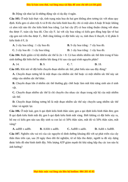 Câu 103. Ở một loài thực vật, tính trạng màu hoa do hai gen không alen tương tác với nhau quy