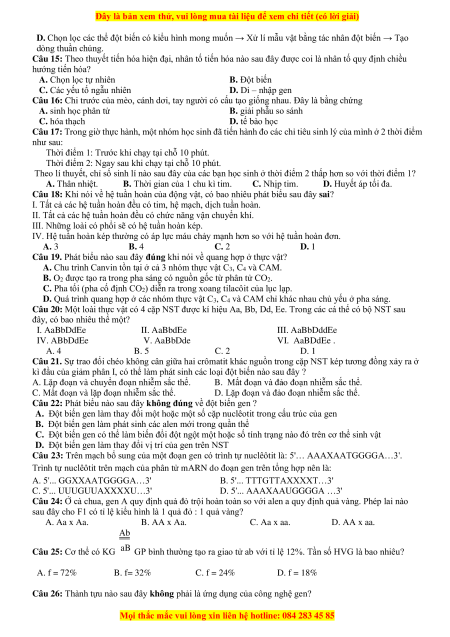 Câu 11: Phép lai nào dưới đây thuộc phép lai phân tích? A. Aa × Aa hoặc AA × AA. B. Aa × Aa hoặc Aa × aa. C. Aa × aa hoặc AA × aa. D. Aa × AA hoặc Aa × aa.