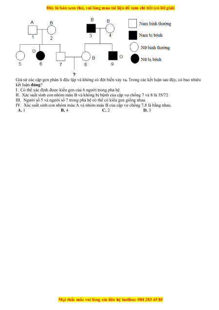 đều trội hoàn toàn so với alen IO quy định nhóm máu O và bệnh trong phả hệ là do một trong 2 alen của