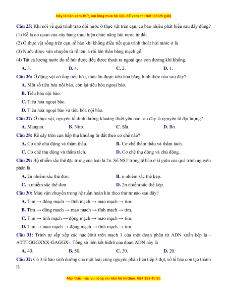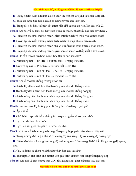 Câu 8: Lực nào sau đây không phải là động lực của dòng mạch gỗ? A. Áp suất rễ.
