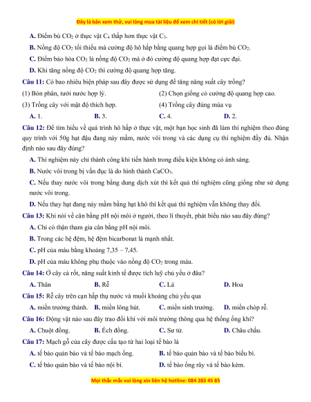 Câu 10: Khi nói về ảnh hưởng của CO2 đến quang hợp, phát biểu nào sau đây sai?