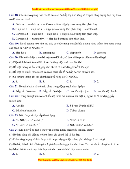 Câu 19: Sắc tố quang hợp nào sau đây có chức năng chuyển hóa quang năng thành hóa năng trong