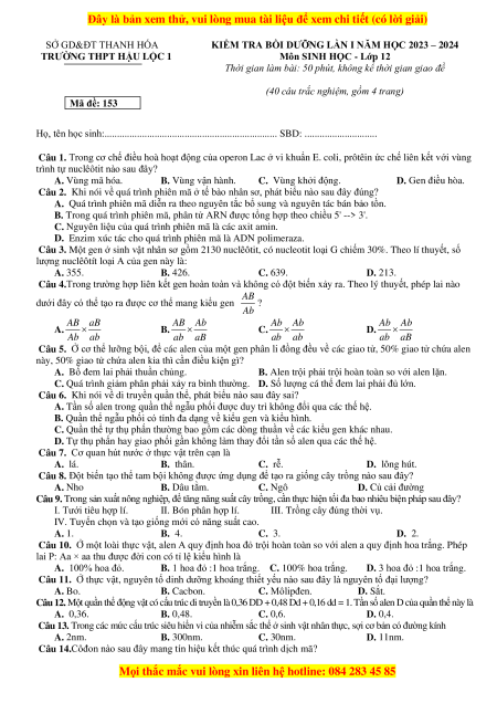 Đề thi thử tốt nghiệp Sinh học trường THPT Hậu Lộc 1 năm 2024
