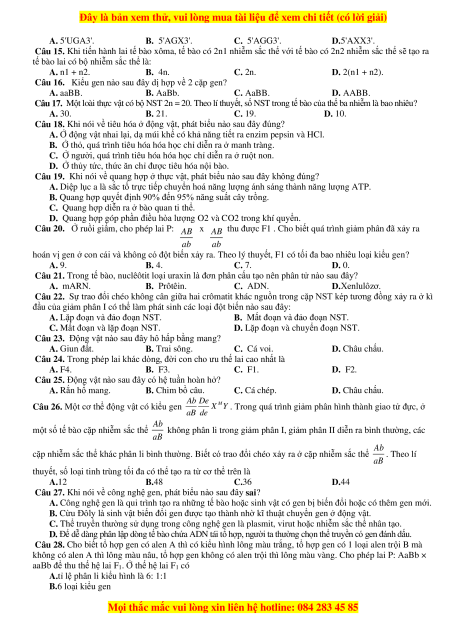 Câu 4.Trong trường hợp liên kết gen hoàn toàn và không có đột biến xảy ra. Theo lý thuyết, phép lai nào AB