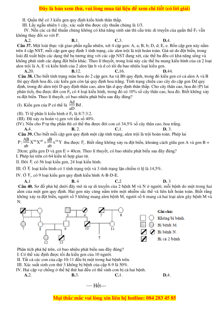 IV. Hai cặp vợ chồng ở thế hệ thứ hai đều có thể sinh con bị cả hai bệnh. A.2. B.3. C.1. D.4. ---- Hết---