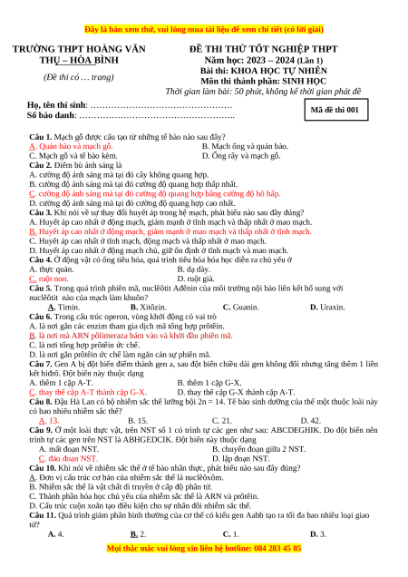 Bài thi: KHOA HỌC TỰ NHIÊN
