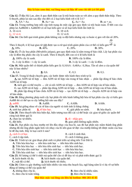 Câu 18. Bằng phương pháp nuôi cấy hạt phấn rồi tiến hành lưỡng bội hóa từ hạt phấn của cây có kiểu gen