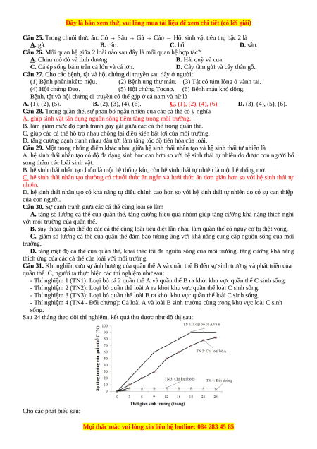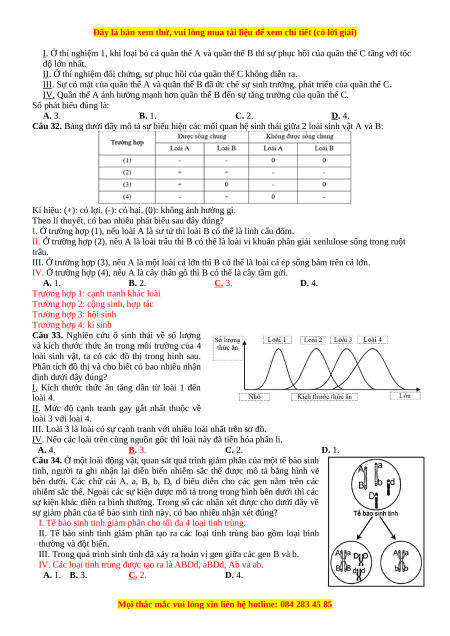 Câu 31. Khi nghiên cứu sự ảnh hưởng của quần thể A và quần thể B đến sự sinh trưởng và phát triển của