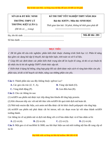 Đề thi thử tốt nghiệp Sinh học trường THPT Lý Thường Kiệt lần 1 năm 2024