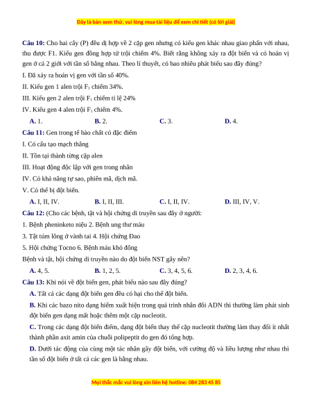 Câu 17: Khi nói về đột biến gen, phát biểu nào sau đây không đúng?