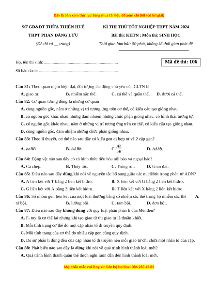 Đề thi thử tốt nghiệp Sinh học trường THPT Phan Đăng Lưu - Thừa Thiên Huế năm 2024