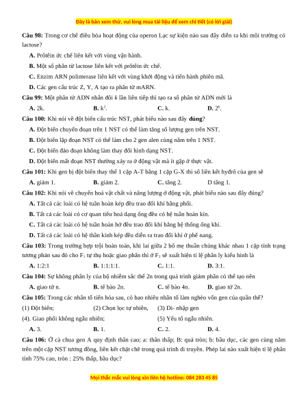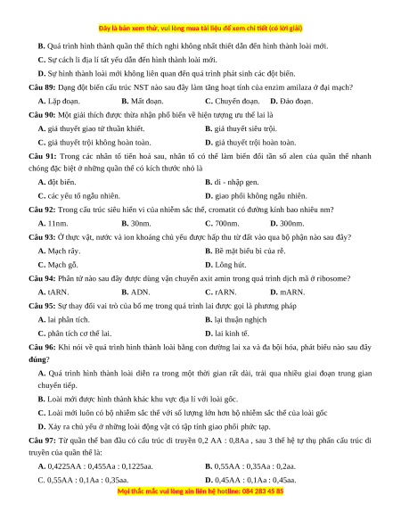 Câu 89: Dạng đột biến cấu trúc NST nào sau đây làm tăng hoạt tính của enzim amilaza ở đại mạch? A. Lặp đoạn. B. Mất đoạn.