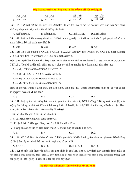 Câu 107: Từ một cơ thể có kiểu gen AabbDdEE, có thể tạo ra cơ thể có kiểu gen nào sau đây bằng