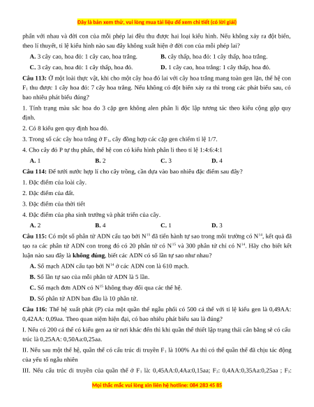 Bài thi: KHTN ; Môn thi: SINH HỌC