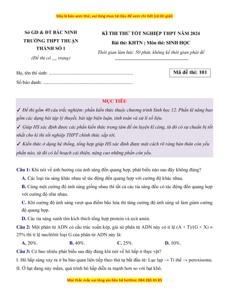 Đề thi thử tốt nghiệp Sinh học trường THPT Thuận Thành 1 năm 2024