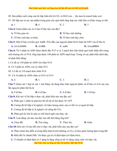 Câu 3: Có bao nhiêu phát biểu sau đây đúng khi nói về hô hấp ở thực vật?